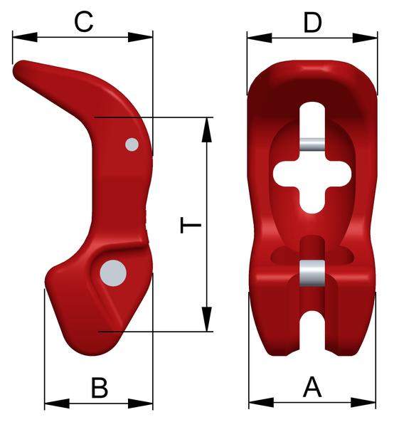 | Bezeichnung | Nenndicke Kette [mm] | Tragfähigkeit [kg] | A [mm] | B [mm] | C [mm] | D [mm] | T [mm] | ca. Gewicht (netto) [kg] |