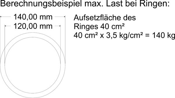 Für die Berechnung der max. Tragfähigkeit bei Ringen kalkulieren Sie mit einer max. Tragfähigkeit von 3,5 kg pro cm² Auflagefläche.