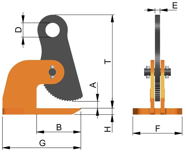 | Bezeichnung | Tragfähigkeit pro Paar [kg] | Greifbereich A [mm] | B [mm] | D [mm] | E [mm] | F [mm] | G [mm] | H [mm] | T [mm] | ca. Gewicht (netto) [kg] |