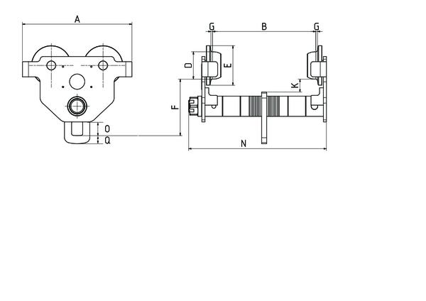 | Tragfähigkeit [kg] | Flanschbreite (min/max) [mm] | Kurvenradius (min) [m] | A [mm] | D [mm] | E [mm] | F [mm] | G [mm] | K [mm] | N [mm] | O [mm] | P [mm] | Q [mm] | R [mm] | ca. Gewicht (netto) [kg] |