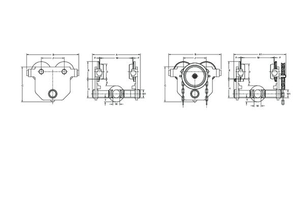 Die dargestellten manuellen Fahrwerke sind ausgelegt für den Einsatz mit manuellen Hebezeugen.