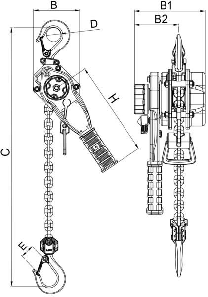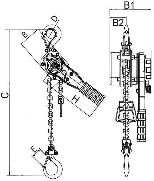 | Tragfähigkeit [kg] | Hubkraft [daN] | Anzahl Kettenstränge | Abmessung Kette [mm] | B [mm] | B1 [mm] | B2 [mm] | C [mm] | D [mm] | E [mm] | H [mm] | Gewicht bei 1,5 m Hub [kg] |