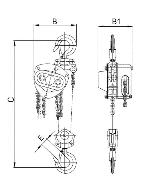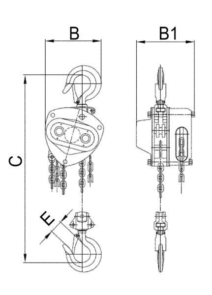 Tragfähigkeit [kg]Handkettenzugkraft [daN]Hubhöhe (Standard) [m]Kettengröße [mm]Anzahl KettensträngeB [mm]B1 [mm]C [mm]E [mm]Gewicht je m Mehrhub [kg]Gewicht mit Standardhub [kg]