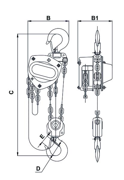 | Tragfähigkeit [kg] | Kettenstränge [Stück] | Kettengröße [mm] | kleinstes Hakenmaß [mm] | B [mm] | B1 [mm] | C [mm] | D [mm] | E [mm] | ca. Gewicht (netto) [kg] | Gewicht je m Mehrhub [kg] |