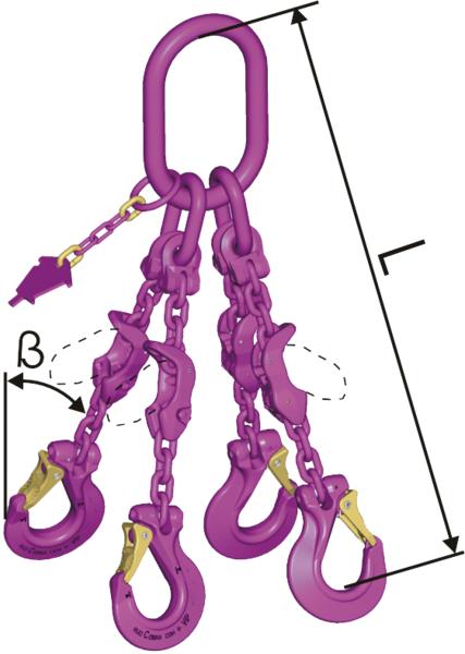 | Bezeichnung | Nenndicke Kette [mm] | Tragfähigkeit 4 Strang NW 0-45° [kg] | Tragfähigkeit 4 Strang NW 45-60° [kg] | Länge [m] | ca. Gewicht (netto) [kg] |
