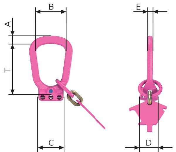 | Bezeichnung | Nenndicke Kette [mm] | Tragfähigkeit NW 0-45° [kg] | Tragfähigkeit NW 45-60° [kg] | A [mm] | B [mm] | T [mm] | ca. Gewicht (netto) [kg] |