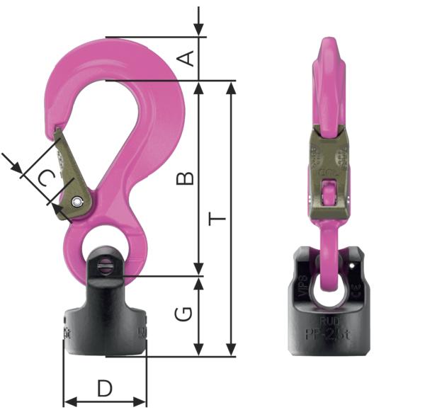 | Bezeichnung | Tragfähigkeit (senkrecht) [kg] | A [mm] | B [mm] | C [mm] | D [mm] | G [mm] | T [mm] | ca. Gewicht (netto) [kg] |